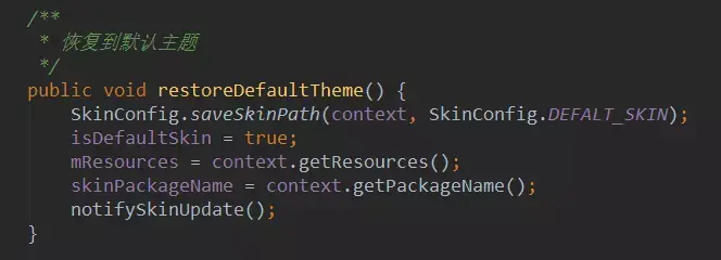 这个方法就是恢复到系统的默认主题,原理和load都差不多,实现还简单了很多。SkinManager这个类就说这么多,详细实现请到源码中去查看,很多地方我都给了注释。