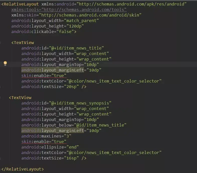 其中xmlns:skin=”http://schemas.android.com/android/skin“是我们自定义的,在SkinConfig有。 我们只需在有皮肤更改需求的View中加入skin:enable=”true” 就OK了。