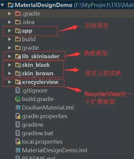 这个框架的换肤机制是使用动态加载的机制去加载皮肤包里面的内容,无需Acitvity重启即可实现皮肤的实时更换,皮肤包是可以与原安装包相分离的,需要自己定做(这个皮肤包其实也就是一个普通的Android项目,只是只有资源文件没有类文件而已),这样做的好处就是可以在线提供皮肤包供用户去下载,也可以大大的减少安装包的体积,同时也很好的实现了插件化。其实这个框架是可以拿来直接来用的,直接几行代码基本上就可以解决Android的主题换肤,但是作为一个程序员怎么可以只是简单的知道怎么用就行了吗?如果真是这样就真的太low了。遇到一个好的开源项目我们至少需要把他的源码大致看一下,走一下基本的流程,了解一下他的基本原理,这样我们在技术上才会有所提升。本文实现的Demo是基于在我前段时间发布的Android Material Design 兼容库的使用详解一文中的Demo改进的。最后实现的App也是MaterialDesign的设计风格。