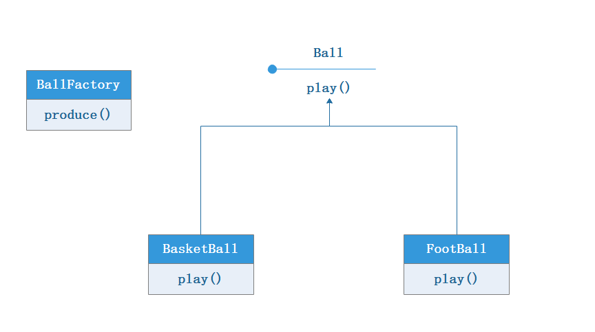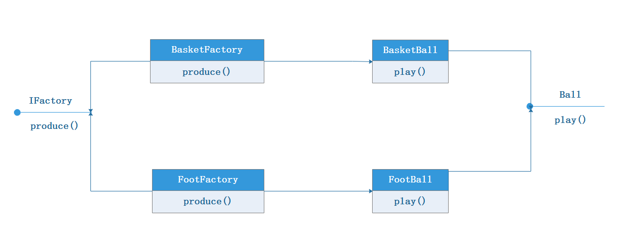 如上所示,如果需要添加新的产品,如排球,我们就多写一个工厂类即可,这样就不会把所有的业务都耦合到一个工厂类中了,用关系图表示如下: