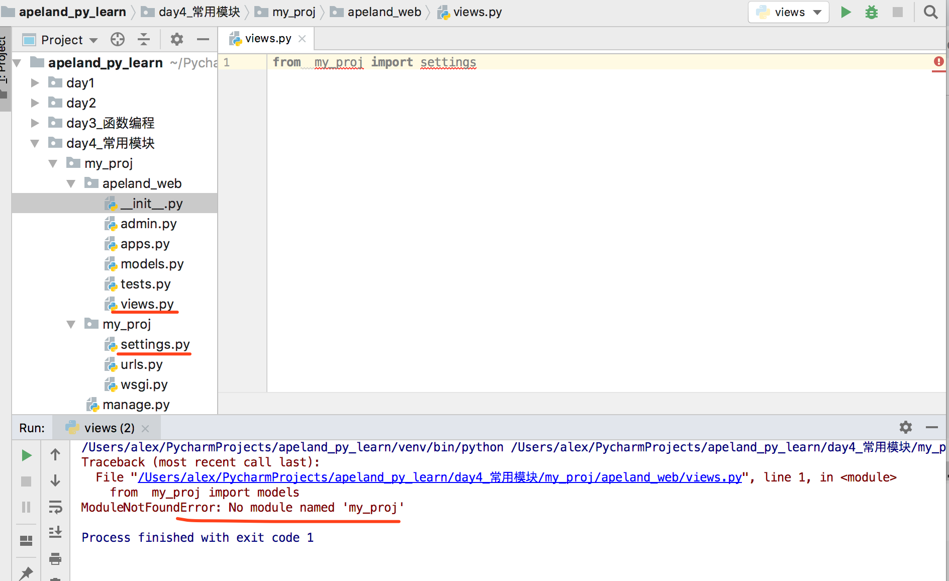 是因为路径找不到,my_proj/settings.py 相当于是apeland_web/views.py的父亲(apeland_web)的兄弟(my_proj)的儿子(settings.py),settings.py算是views.py的表弟啦,在views.py里只能导入同级别兄弟模块代码,或者子级别包里的模块,根本不知道表弟表哥的存在。这可怎么办呢?