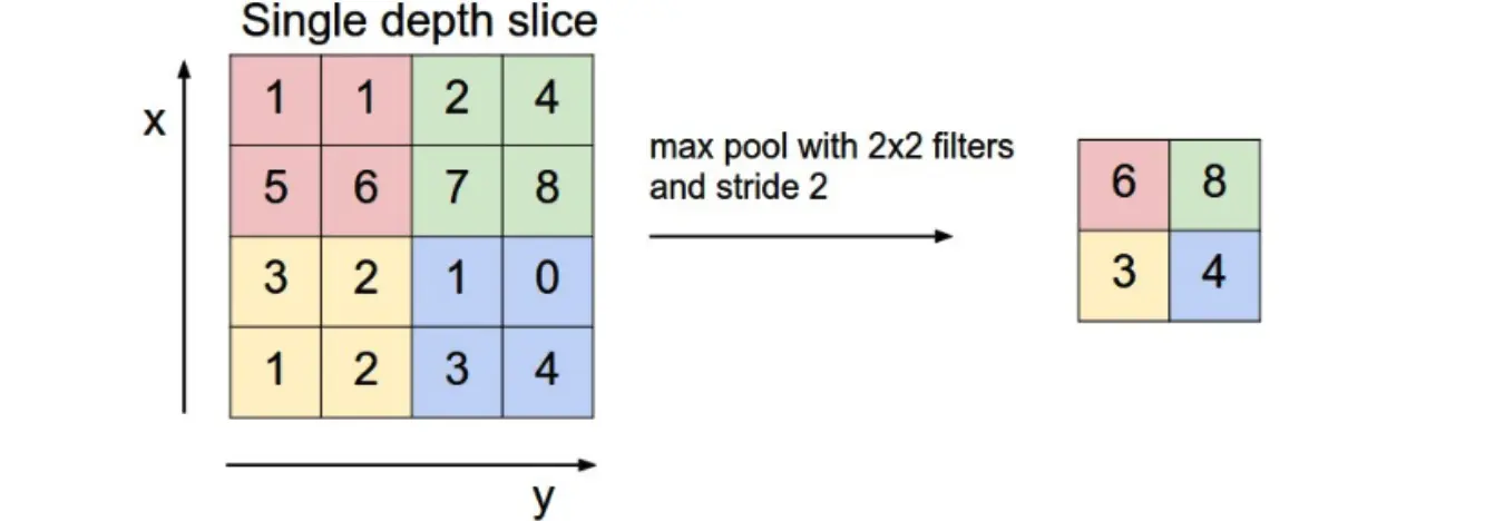 上图所展示的是取区域最大,即上图左边部分中 左上角2x2的矩阵中6最大,右上角2x2的矩阵中8最大,左下角2x2的矩阵中3最大,右下角2x2的矩阵中4最大,所以得到上图右边部分的结果:6 8 3 4。
