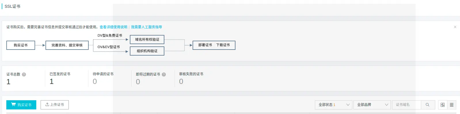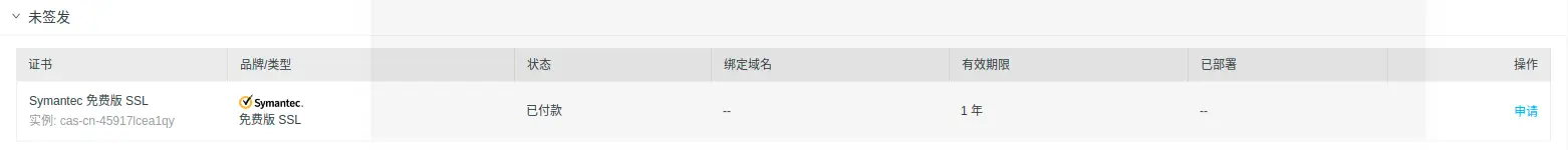 返回控制台可以看见一个未签发的证书,申请签发
