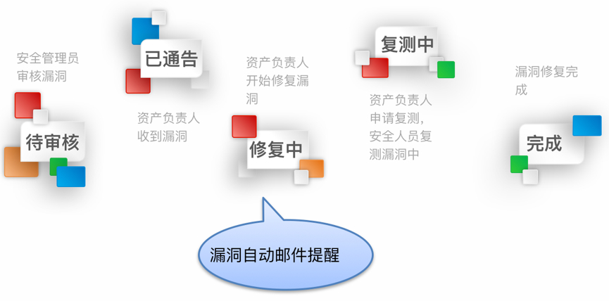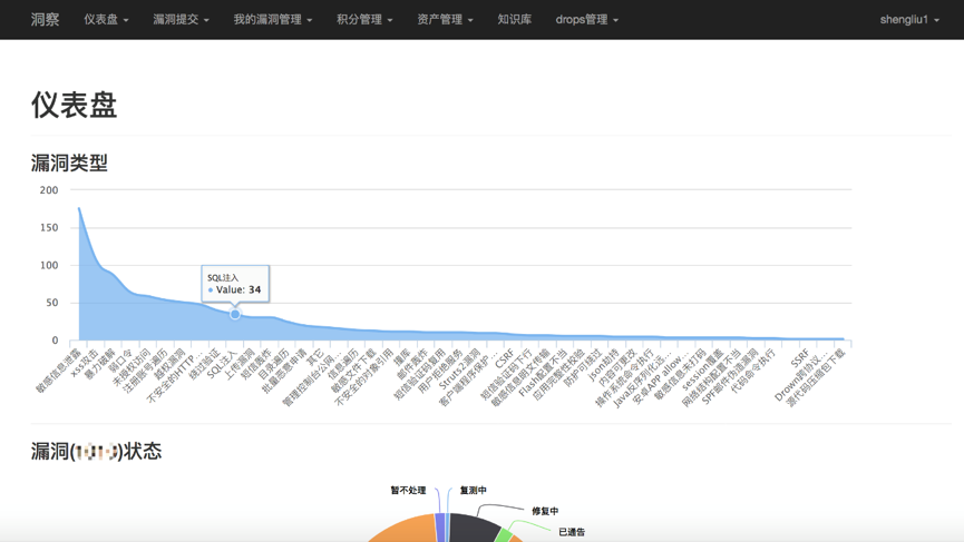 - 漏洞生命周期管理:对公司应用系统产生的安全漏洞进行线上提交、通告、知悉、复测、分类、风险计算、修复期限计算、邮件提醒、漏洞数据分析统计等。