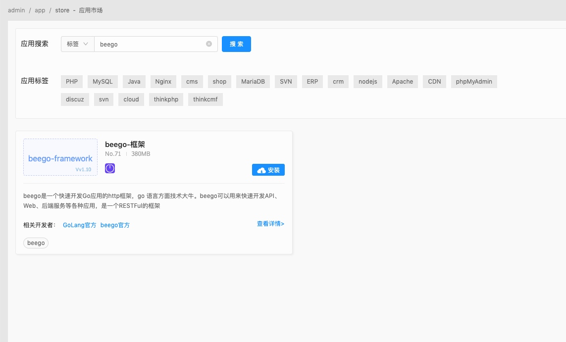 1.登录URLOS系统后台,在应用市场中搜索“beego”,找到之后,直接点击安装按钮