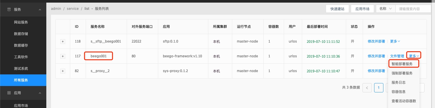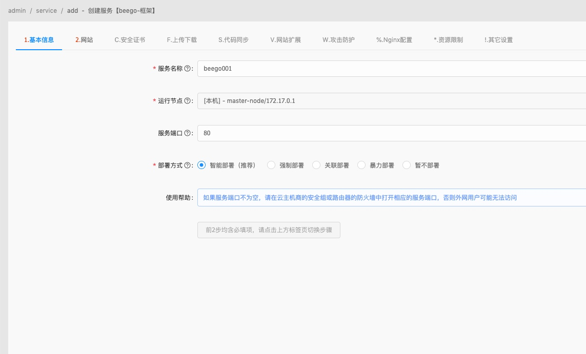 2.填写服务名称、选择运行节点、服务端口、选择智能部署