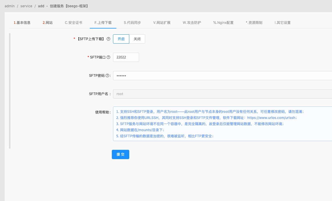 选择“上传与下载”选项卡,开启SFTP上传下载并填写SFTP端口、SFTP密码;