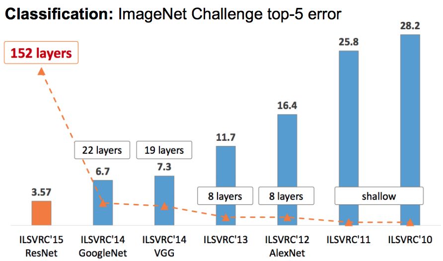 让深度学习在学术界名声大噪的是 2012 年的 ILSVRC 评测。在这之前,最好的 top5 分类错误率在 25%以上,而 2012 年 AlexNet 首次在比赛中使用了深层的卷积网络,取得了 16%的错误率。之后每年都有新的好成绩出现,2014 年是 GoogLeNet 和 VGG,而 2015 年是 ResNet 残差网络,目前最好系统的 TOP5 分类错误率在 5%以下了。