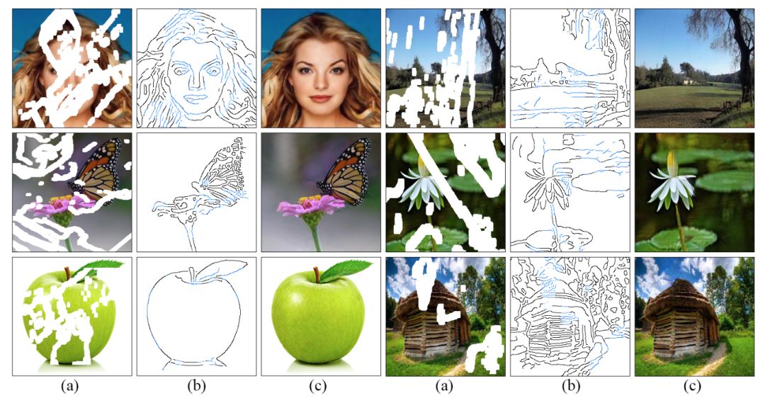 《EdgeConnect: Generative Image Inpainting with Adversarial Edge Learning》这篇文章借鉴人类绘画时先画轮廓(线)后上色的过程,通过把 inpainting 分成 edge generator 和 image completion network 两个步骤,如下面是它的效果。