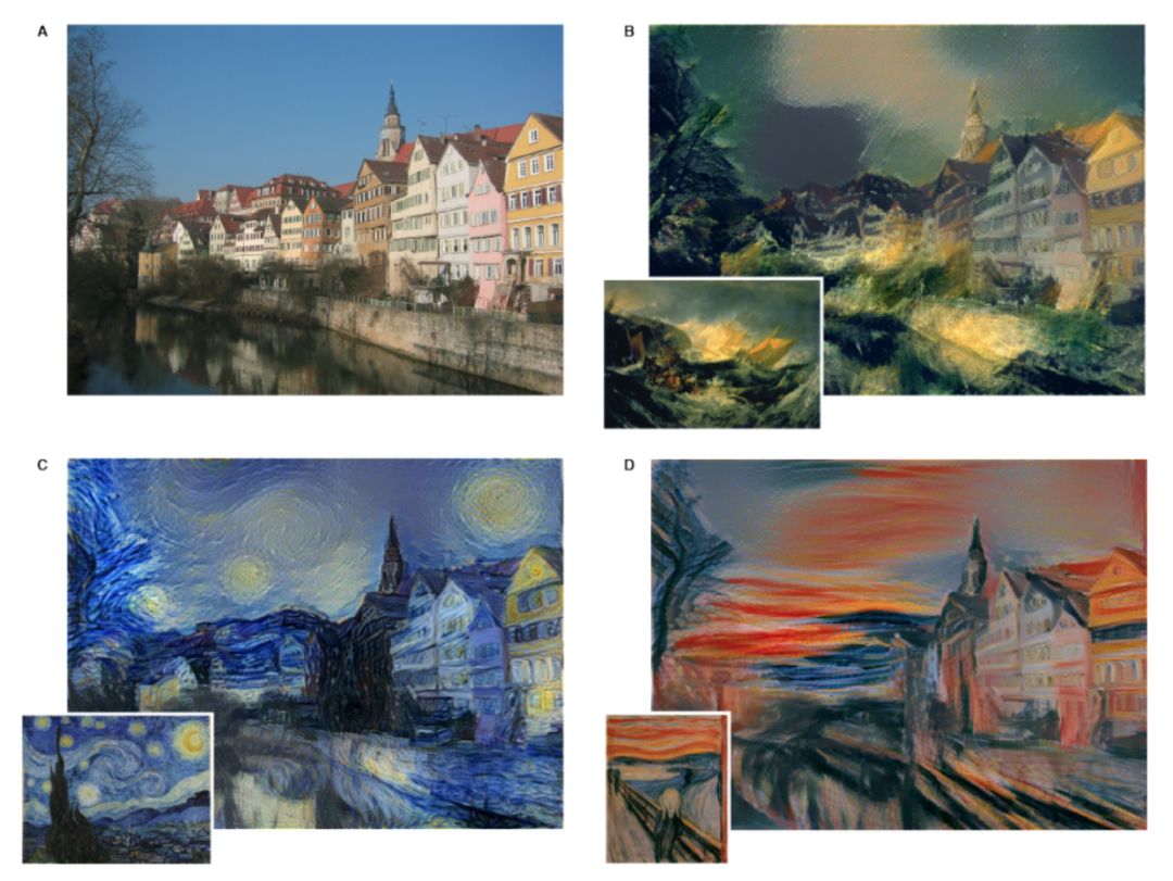 最早的《A Neural Algorithm of Artistic Style》发表于 2015 年,这还是在 GAN 提出之前,不过我还是把它放到生成模型这里了。它当年可是火过一阵,还因此产生了一个爆款的 App 叫 Prisma。如下图所示,给定一幅风景照片和一幅画(比如 c 是梵高的画),使用这项技术可以在风景照片里加入梵高的风格。