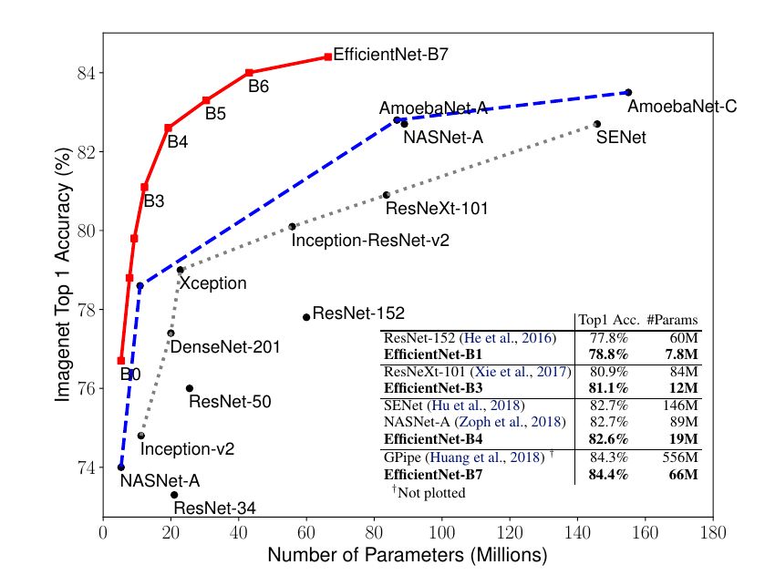自动网络优化最新的文章是 Google 研究院的《EfficientNet: Rethinking Model Scaling for Convolutional Neural Networks》,它希望找到一个神经网络扩展方法可以同时提高网络的准确率和效率(减少参数)。要实现这点,一个很关键的步骤便是如何平衡宽度、深度和分辨率这三个维度。