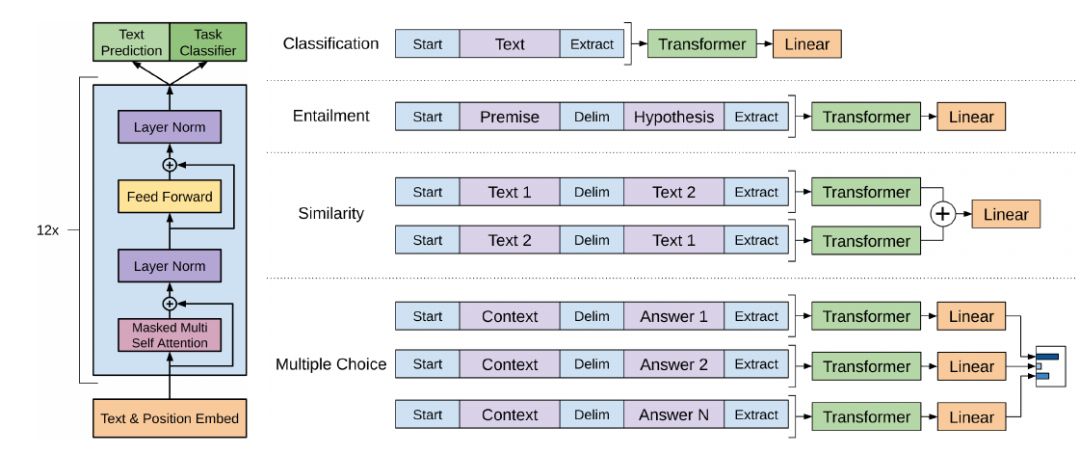 ELMo 学到的语言模型参数是固定的,下游的任务把它的隐状态作为特征。而来自论文《Improving Language Understanding by Generative Pre-Training》的 OpenAI GPT 模型会根据特定的任务进行调整(通常是微调),这样得到的句子表示能更好的适配特定任务。它的思想其实也很简单,使用 Transformer 来学习一个语言模型,对句子进行无监督的 Embedding,然后根据具体任务对 Transformer 的参数进行微调。因为训练的任务语言模型的输入是一个句子,但是下游的很多任务的输入是两个,因此 OpenAI GPT 通过在两个句子之前加入特殊的分隔符来处理两个输入,如下图所示。