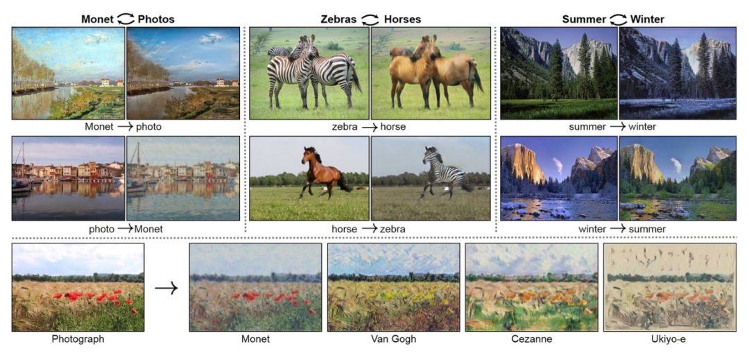 本文介绍的 Cycle GAN 不要求有配对的训练数据,而只需要两个不同 Domain 的未标注数据集就行了。比如要把普通马变成斑马,我们只需要准备很多普通马的照片和很多斑马的照片,然后把所有斑马的照片放在一起,把所有的普通马照片放到一起就行了,这显然很容易。风景画变梵高风格也很容易——我们找到很多风景画的照片,然后尽可能多的找到梵高的画作就可以了。它的效果如下图所示。