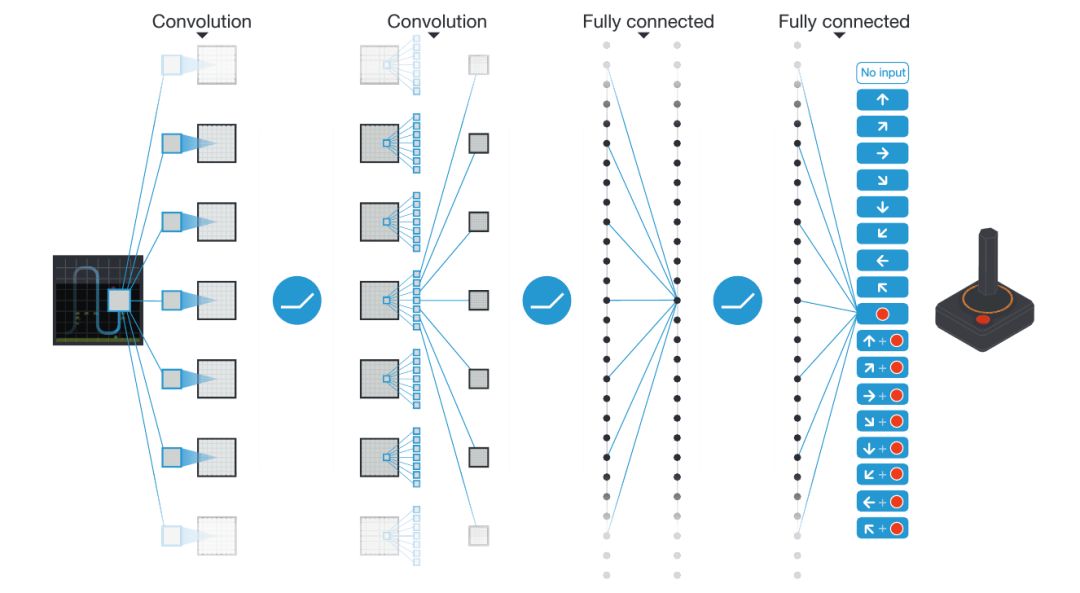 Google DeepMind 在 Nature 发表的文章《Human-level Control through Deep Reinforcement Learning》首次实现了 End-to-End 的深度强化学习模型 Deep Q-Networks,它的输入是游戏画面的像素值,而输出是游戏的控制命令,它的原理如下图所示。