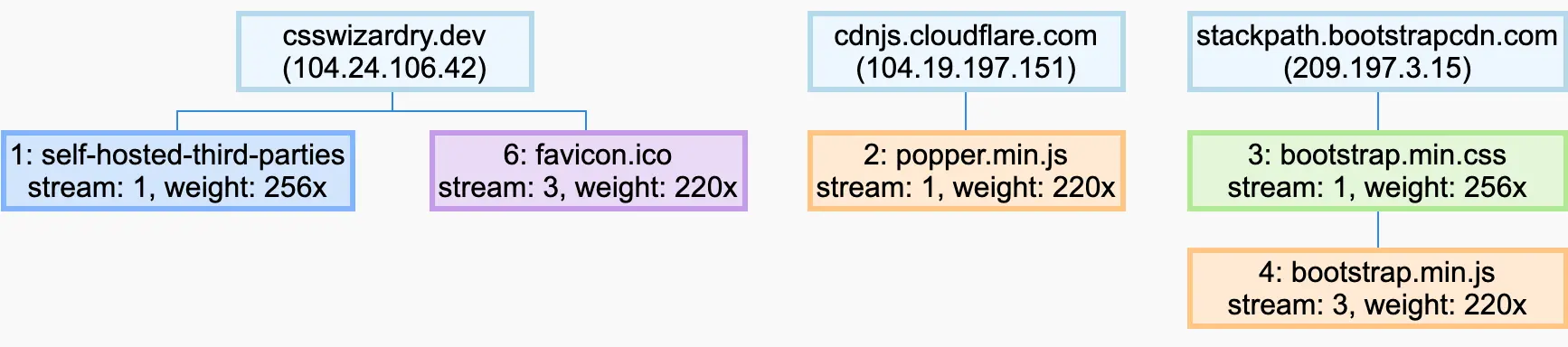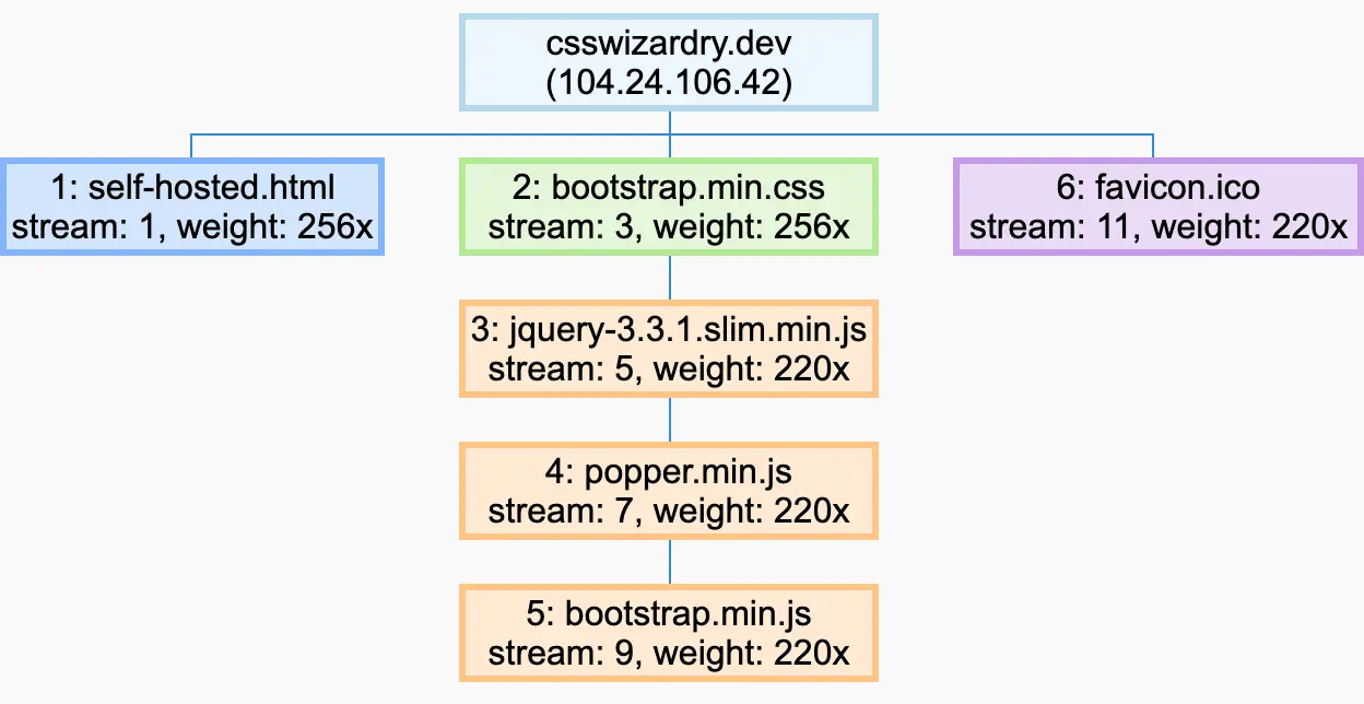 第二个扣分项以协议层优先处理的形式存在,而这种优先处理在我们将内容跨域存放是被破坏了。如果你用 HTTP/2(你确实应该用),你就会用到优先处理。同一个 TCP 连接上的所有的流(也就是说资源)都有一个优先级,而浏览器和服务器会协作建立这些优先处理流的依赖树,从而优先递送关键资源,延迟递送不太重要的资源。