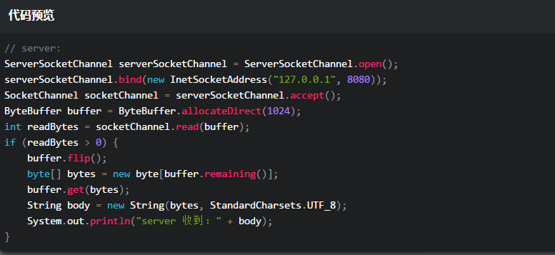 与Buffer配合,使用read方法可以把数据从Channel读到Buffer里面,然后做后续处理。