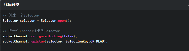 使用Selector很简单。使用open方法创建一个Selector对象,然后把Channel注册到Selector上。