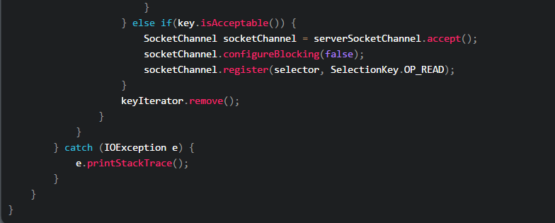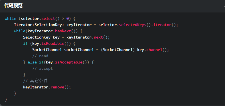 isAcceptable()一般来说,我们很少直接使用单个的SelectionKey,而是从Selector里面轮询所有的SelectionKey,比如: