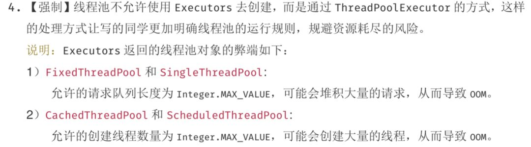 但是,故事要转折了。阿里巴巴的Java开发手册中明确地指出,不允许使用Executors来创建线程池。