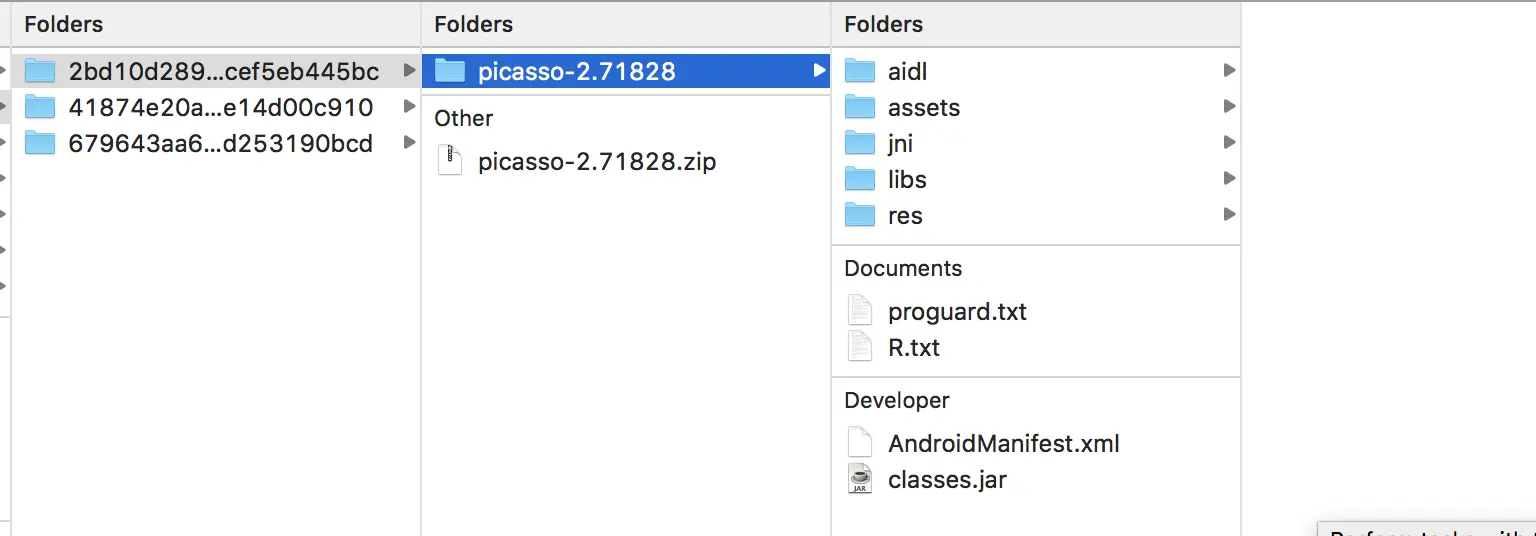 这样就只能找到我们的aar源文件查看了。右键我们Picasso的Gradle依赖,选择Library Properties...选项,在弹出的对话框中就可以看到aar的源文件了。