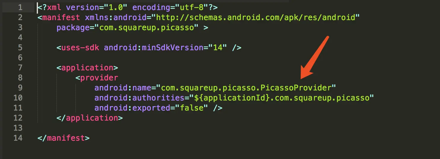很明显,在使用Picasso时我们是不需要在AndroidManifest.xml中注册的,那么PicassoProvider就肯定是注册在picasso的aar文件中的AndroidManifest.xml中了。