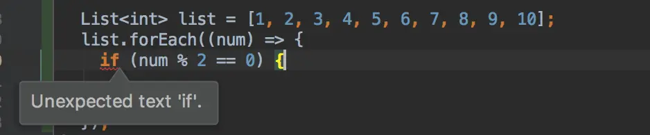 好了,既然dart中的箭头表达式只支持单行表达式,那么我们这里是不能使用它了,那么我们去掉箭头,使用匿名方法即可,如下所示: