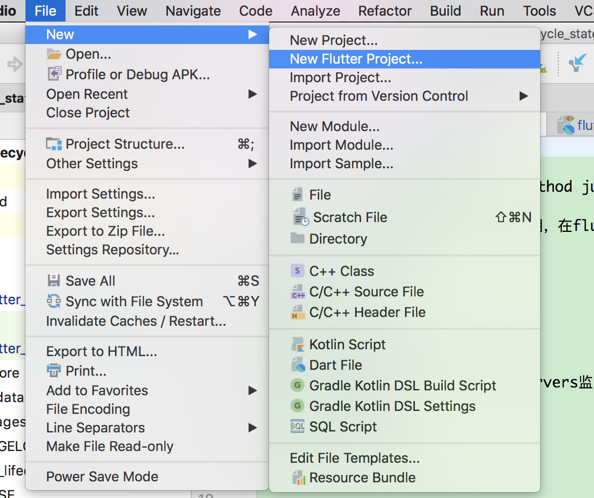 - 在菜单上选择 File -> New -> New Flutter Project。