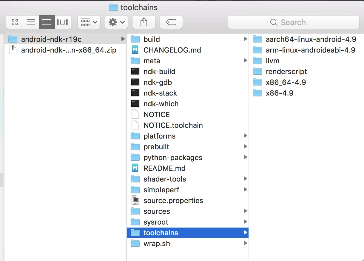 解决错误第一步,去Google,然后我就找到了完美解决 No toolchains found in the NDK toolchains folder for ABI with prefix: mips64el-linux-android这篇文章,按照步骤去官网下载最新的ndk包,发现toolchains目录下并没有mips64el-linux-android前缀的文件。