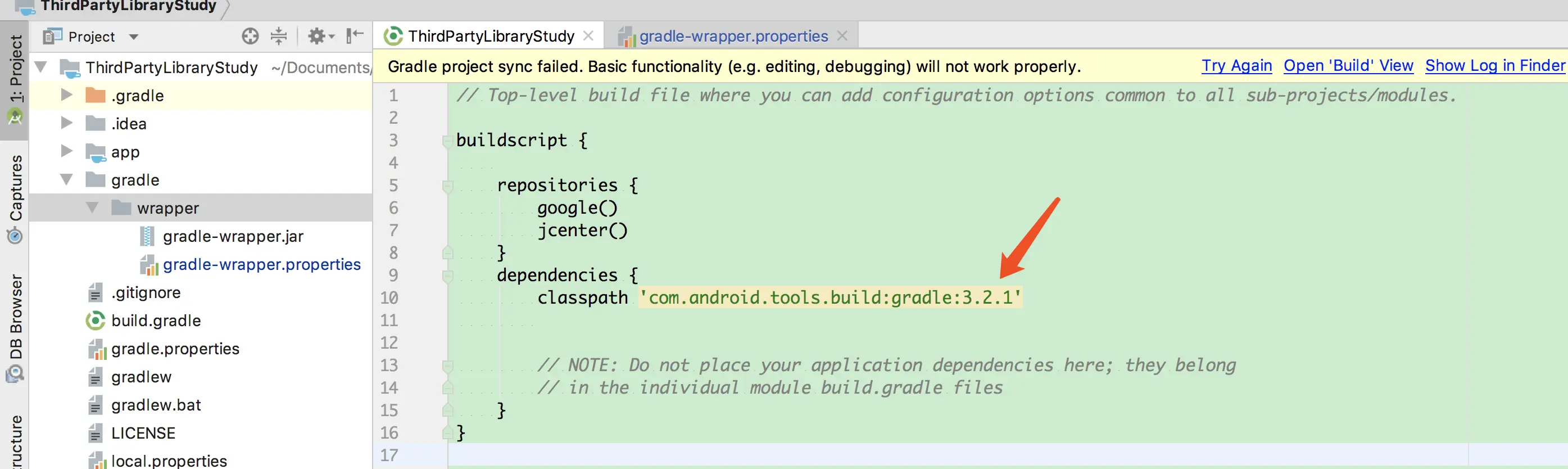具体版本号我们又该如何修改呢?请参看Android Gradle plugin。这里有个小技巧,如果你不知道最新的Gradle版本如何写,那么你创建一个新的Android项目,看下as默认使用的gradle插件版本号是多少,抄过来即可。这里我们选择3.2.1,设置完成后如下所示: