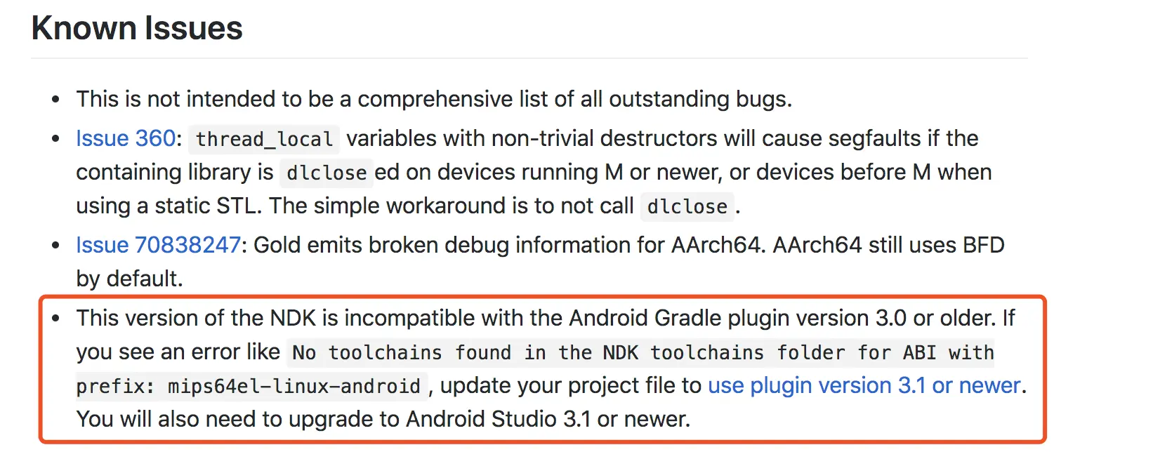 在这个页面的Known Issues模块中,我们发现有下面这段话,它的意思就是,这版的ndk所示不兼容Android Gradle插件的3.0及以下版本的。如果你在这类版本中看到了No toolchains found in the NDK toolchains folder for ABI with prefix: mips64el-linux-android这类提示,就升级你的gradle插件版本到3.1及以上。