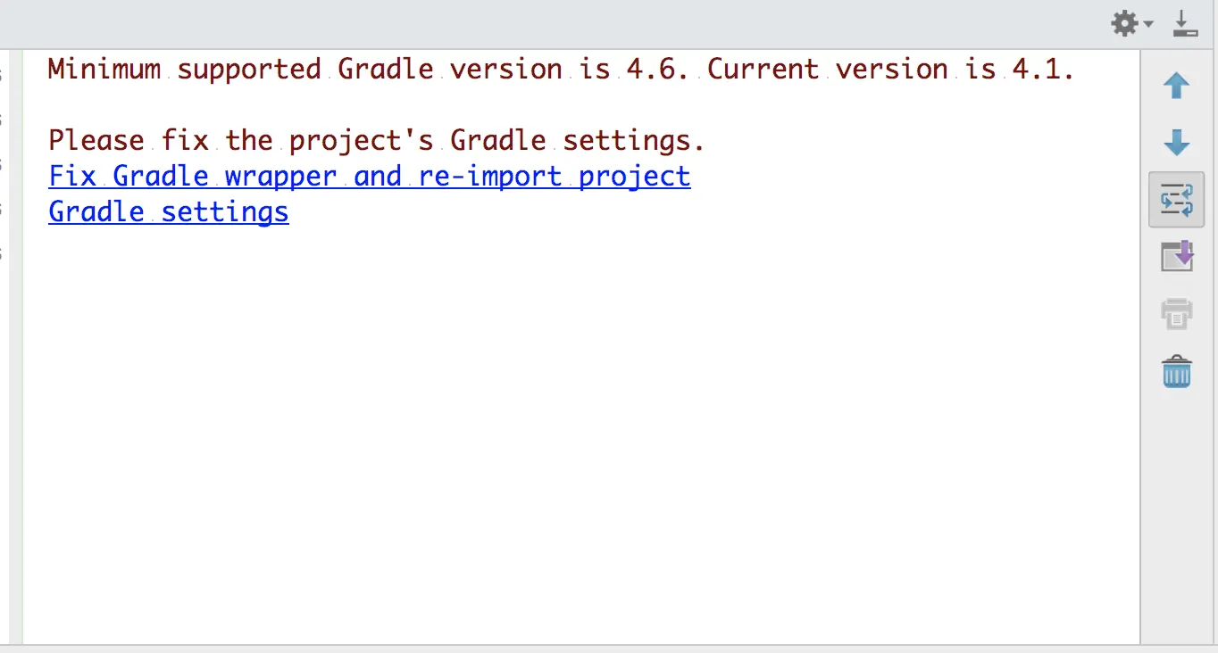 同步下gradle配置,会发现出现了下面这个错误提示,提示我们升级gradle版本,当前版本是4.1,最少需要升级到4.6。如下所示: