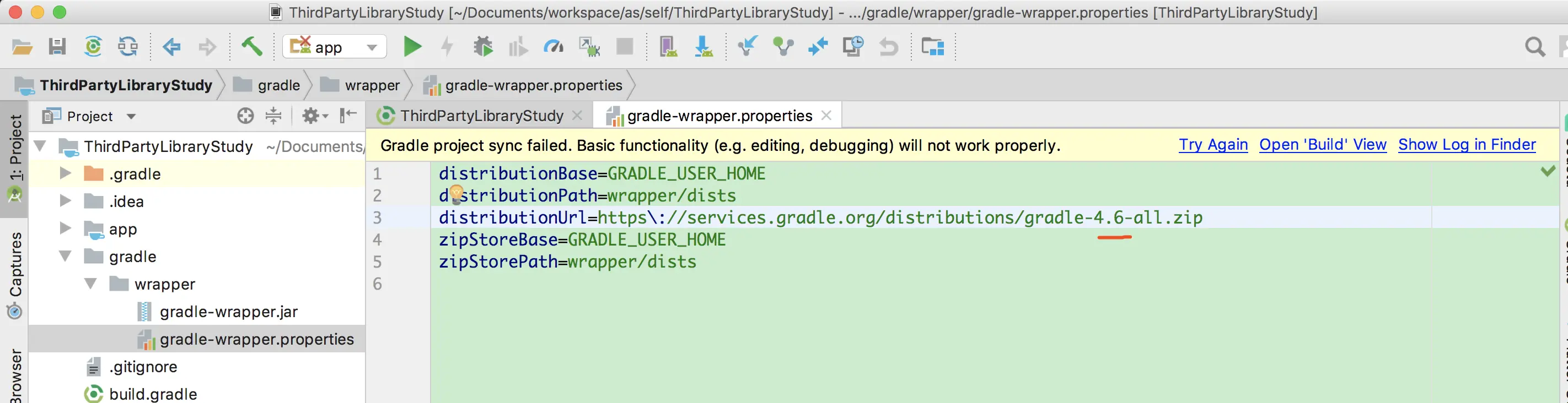 我们打开/gradle/wrapper/gradle-wrapper.properties文件,进行修改,具体指需要将版本号4.6修改为4.6即可。 修改之前: