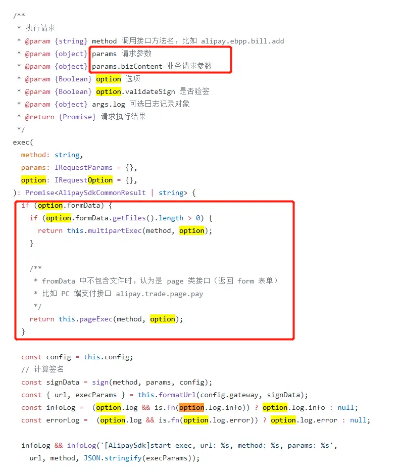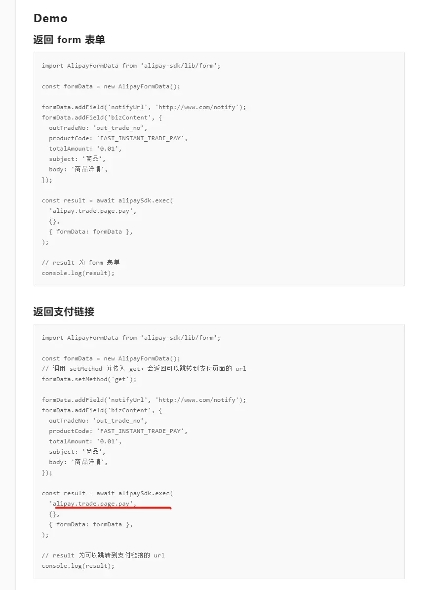- formData提交通过两个(pageExec+multipartExec分别对应PC支付+上传文件),同时如果设置formData的method是get则传回URL(而非form),即formData是两个特例进行处理,因此返回response也跟原始的api不一致(看原始response)
