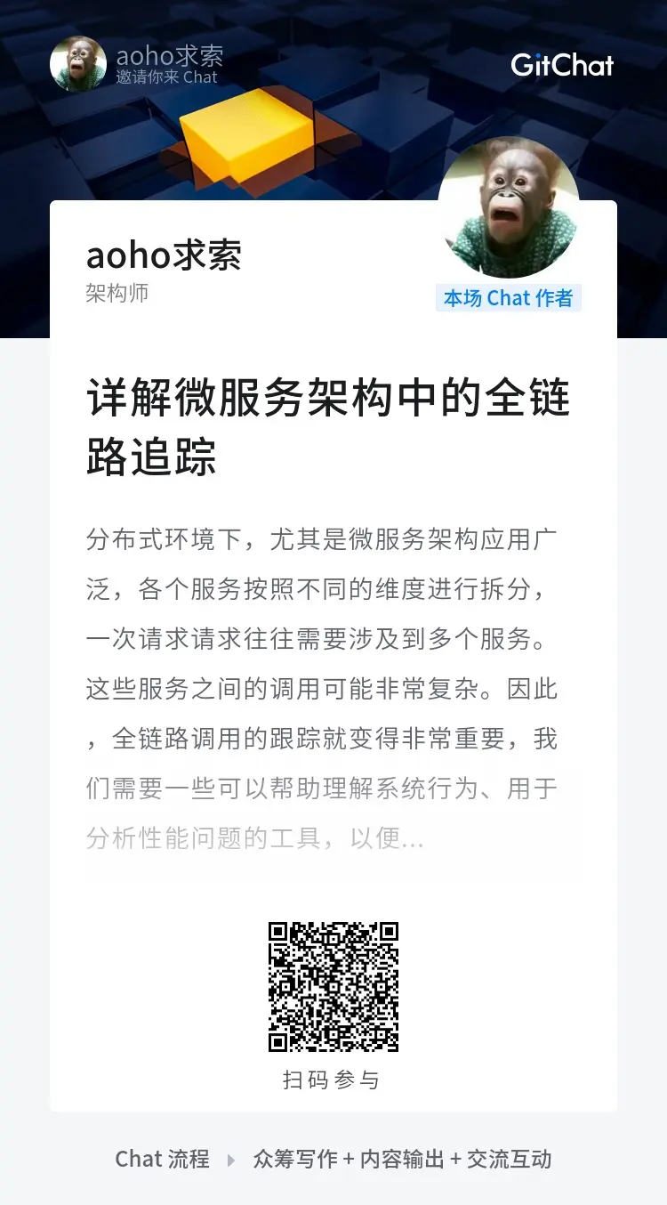 随着微服务架构的流行,请求涉及的调用链异常复杂,引入链路追踪组件便于排查问题。笔者在之前写了 几种分布式调用链监控组件的实践与比较,很多读者关注。在随后的实践中进行了更为深入了解,特此搞了一次 Chat 分享,介绍笔者的一些经验,希望能与大家交流。