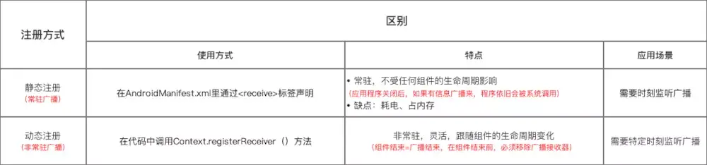 - 注册方式:在AndroidManifest.xml里通过<receive>标签声明