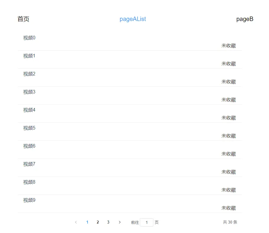- pageAList, 跳转到第三页,点击视频22 -> 进入视频详情页pageADetail,点击收藏,收藏成功,点击返回 -> pageAList显示的是第三页,并且视频22的收藏状态从未收藏变成已收藏,说明从pageADetail进入pageAList,pageAList页面缓存了,并且更新了状态