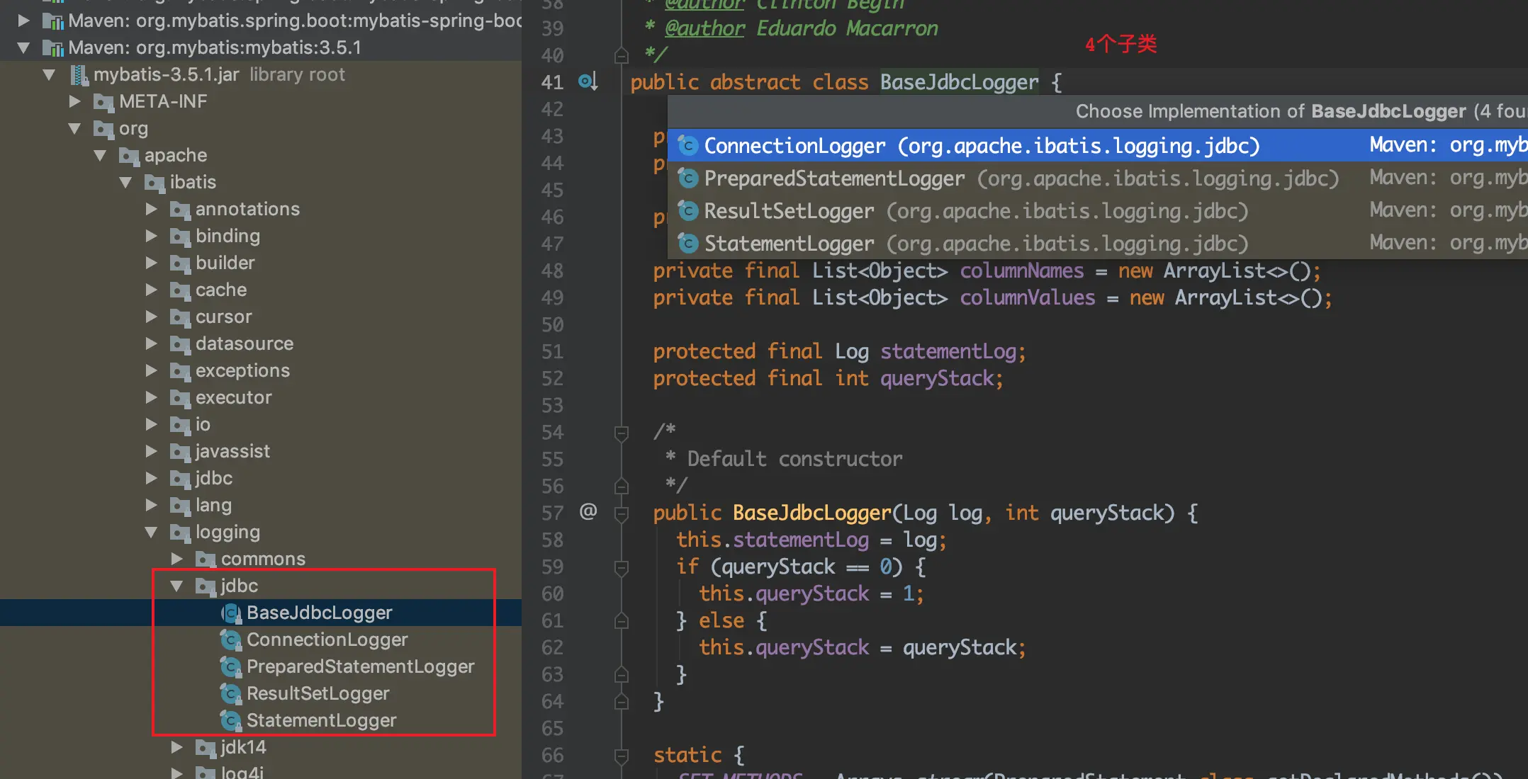 - 抽象类是BaseJdbcLogger,同级包下有4个子类进行集成