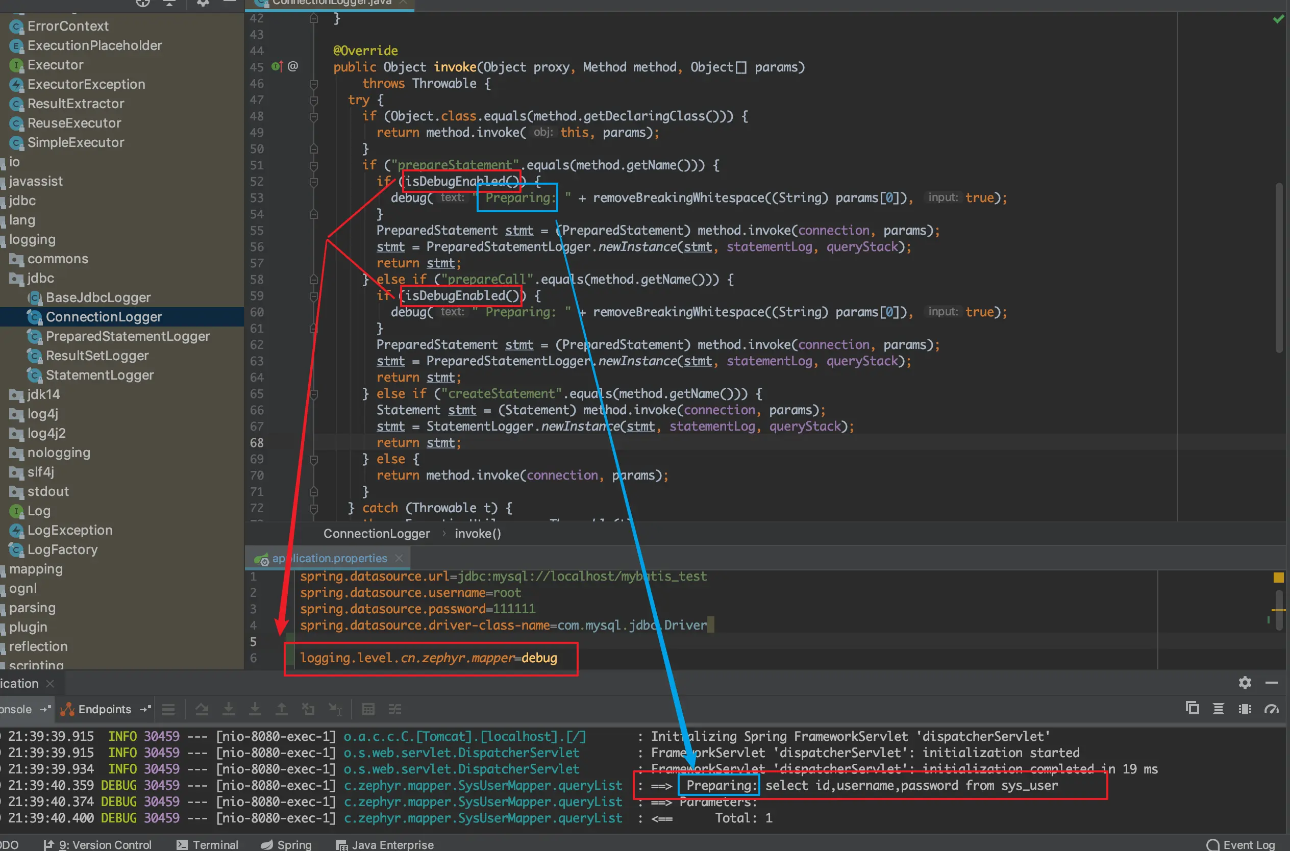 - 以ConnectionLogger为例,各个Executor在执行sql之前获取到的connection,其实是connection的代理对象,通过代理类实现建立连接时的日志打印: