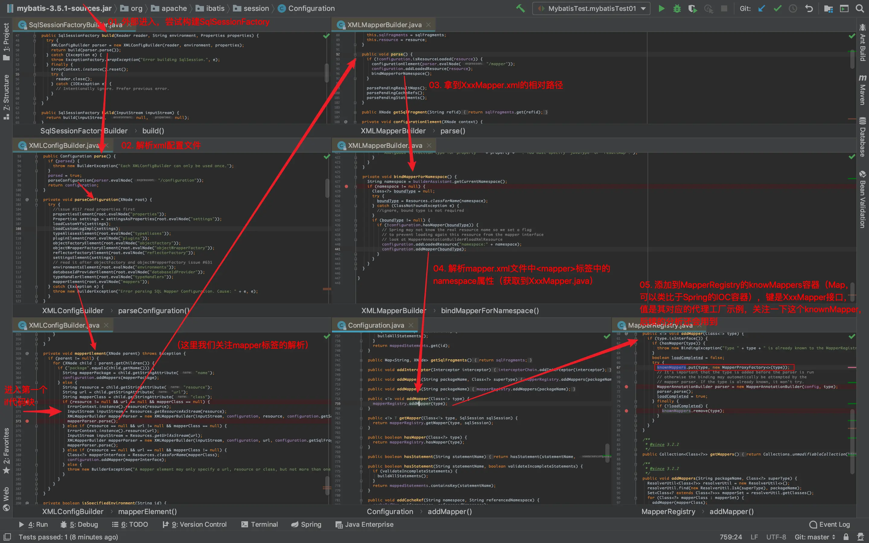 这一步主要做的事情就是根据配置文件获取所有的Mapper.xml,从而获取Mapper接口类,并以Mapper接口类为键,对应的代理工厂对象为值,存储到一个Mapper容器(knownMappers)中。这一步整体的代码执行流程如下图所示:SqlSessionFactory sqlSessionFactory = new SqlSessionFactoryBuilder().build(configFile);