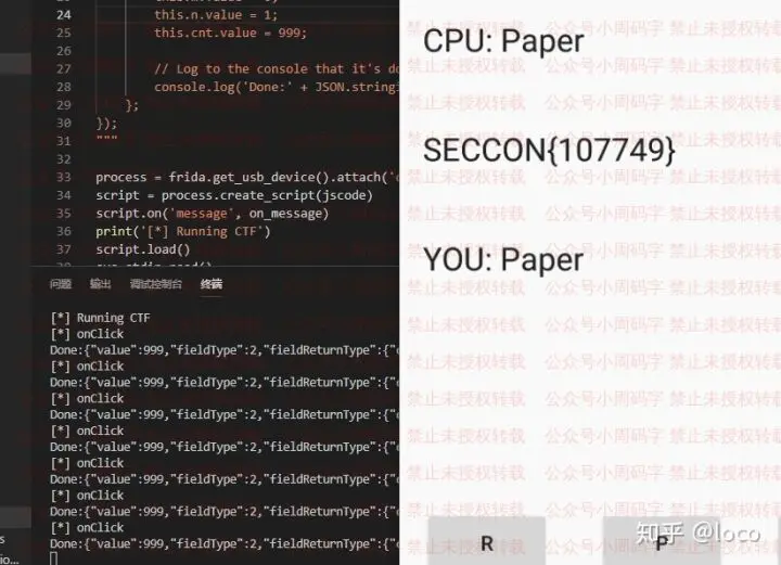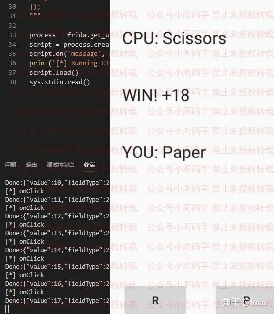 我们先做个比较简单的操作吧,让我们的每次出招都必胜~先复制一下文档中的代码,建一个.py文件粘贴进去,将this.cnt.value = 999;这一条删除或注释掉,然后运行这个python脚本,在注入完成后,不管你怎么点,你都是必定胜利的,如下图:
