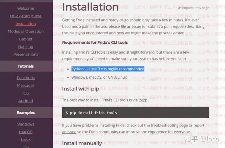 那么怎么使用呢?首先我们在Frida官方文档中的Installation页可以看到,我们需要有Python环境,并且用pip安装一个叫frida-tools的库,然后才可以开始使用。