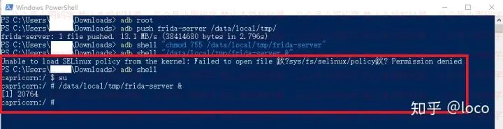 adb shell "/data/local/tmp/frida-server &"如果你的手机和我的一样,直接这么运行会提示权限不足的话,可以先进入adb shell,在执行su命令获取Root权限后(手机端可能会弹出Root授权提示),再运行/data/local/tmp/frida-server &启动frida-server。