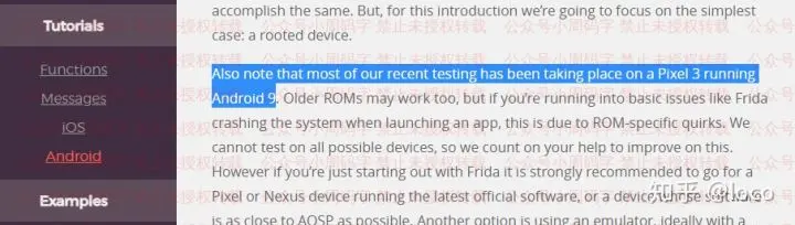文档中能看到,Frida官方最近的大部分测试都是在运行着Android 9的Pixel 3上进行的,所以理论上来讲如果你在使用中遇到任何奇怪的问题,都可能是你手机的系统导致,所以这里再次建议,使用较为原生和偏高版本的系统(建议至少6.0)进行操作。