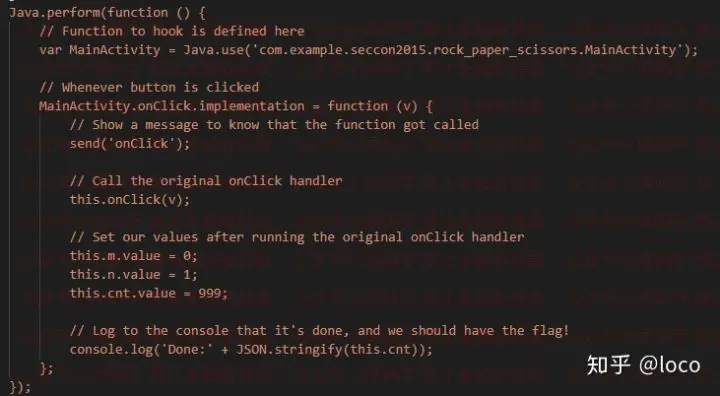 接着就是真正执行Hook的部分了,这个代码中使用了一个MainActivity.onClick.implementation,意思就是Hook前面获取到的类中的onClick方法,后面跟着的赋值函数的部分,函数的参数为对应要Hook方法的参数,内部执行的部分就是在对应方法被调用时所执行的代码,这里它是先打了一个onClick日志,然后调用了原始方法(如果不调用的话原始方法不会被执行),接着它将m、n、cnt(变量具体含义请自行反编译APP后查看代码)的值做了修改,最后,它又打了一个携带着cnt变量值的日志。