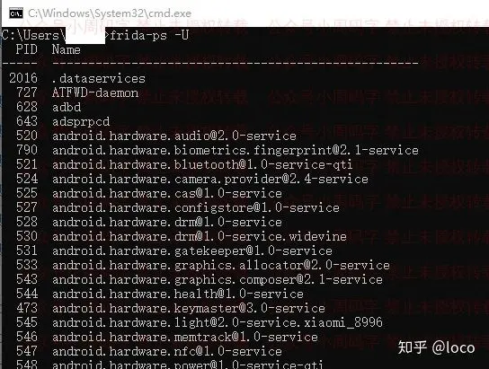 启动后,我们先照惯例来测试一下是否能正常使用了,和前面一样,使用frida-ps命令,但在后面加一个-U参数,这个参数的意思是让它对USB连接的设备操作,如果不出意外的话,你应该能看到与不加-U参数时截然不同的显示。