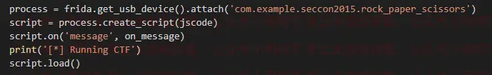 最后是一些常规操作,frida.get_usb_device().attach()是获取指定APP(参数为包名)当前运行着的进程,process.create_script(jscode)、script.load()是将前面的JS代码注入进去,script.on('message', on_message)是设置消息传出时的回调,最后的sys.stdin.read()是输出日志用的。