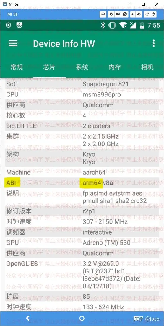 安装后打开它,在芯片栏中我们可以看到一个叫ABI的东西,右边就是我们手机的CPU架构了,如下: