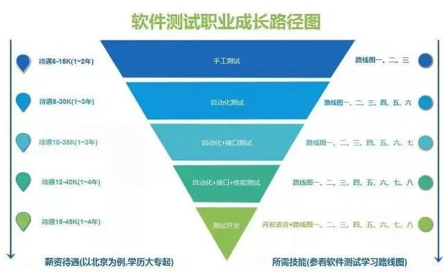 虽然软件测试是IT行业中最适宜转行、练级的新手区。但是对于每个从业者而言,不可能长期满足于“新手村”的要求和待遇。随着软件测试人员从业年限、处理问题能力的提升速度、发展方向的不同等,测试人员薪资差距会逐渐拉大,甚至某些测试人员,五年就能与同期工作人员工资拉开2至5倍差距。