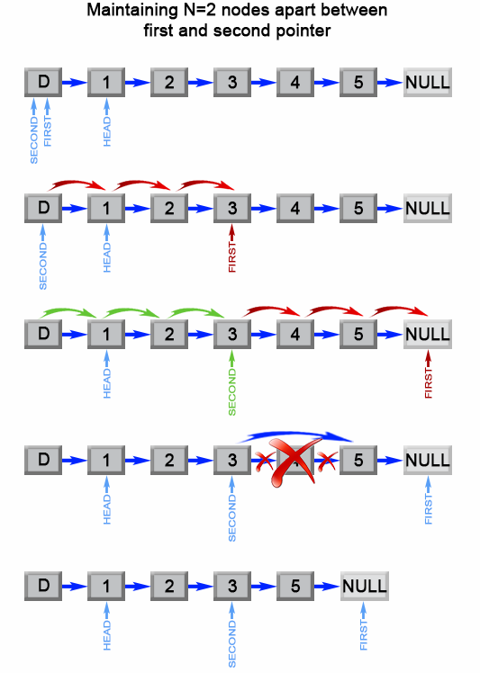Given linked list: 1->2->3->4->5, and n = 2.
