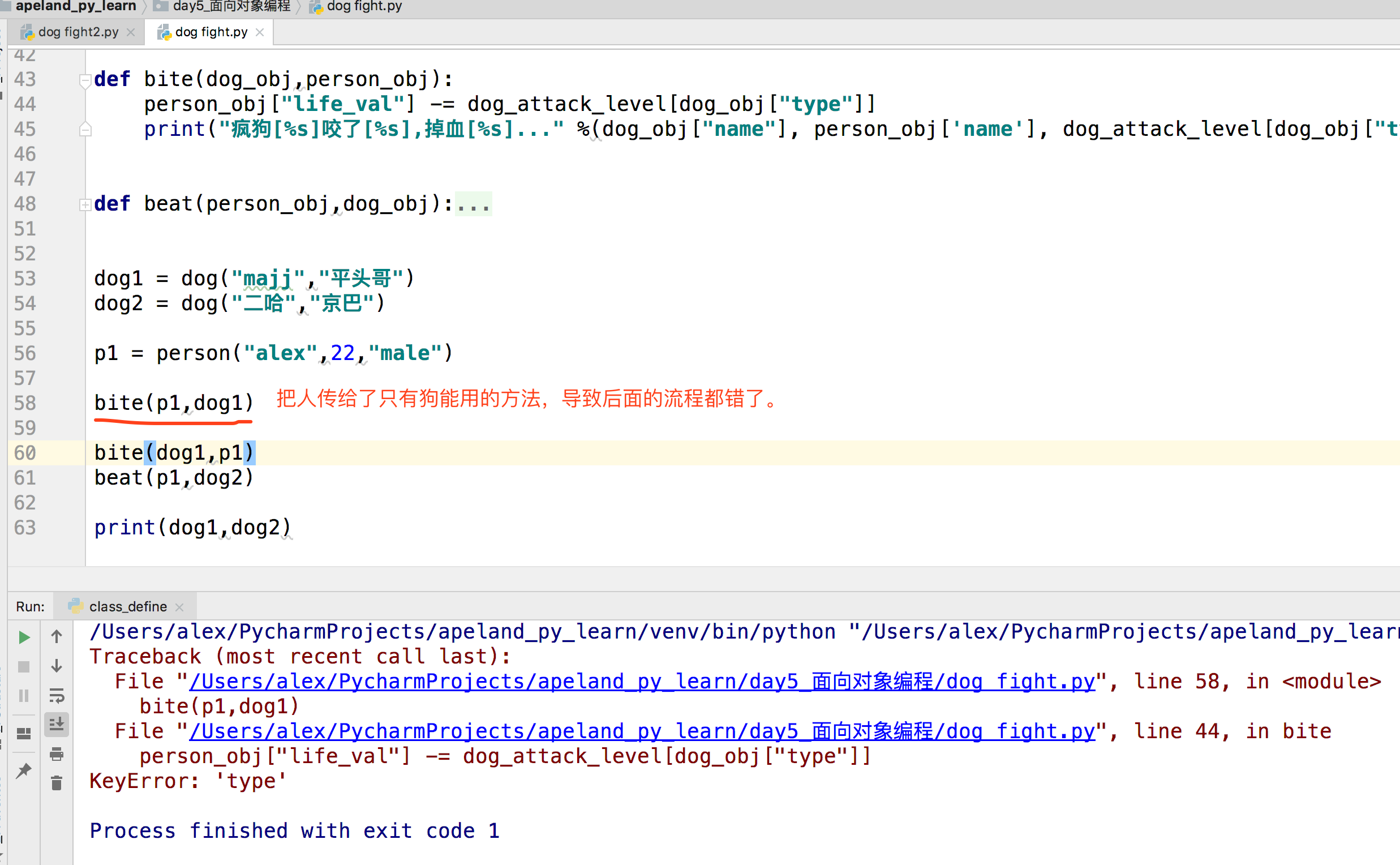 def bite(dog_obj,person_obj): person_obj["life_val"] -= dog_attack_level[dog_obj["type"]] print("疯狗[%s]咬了[%s],掉血[%s]..." %(dog_obj["name"], person_obj['name'], dog_attack_level[dog_obj["type"]]) ) def beat(person_obj,dog_obj): dog_obj["life_val"] -= person_obj['attack_level'] print("[%s] 打了 疯狗[%s],狗掉血[%s]..." %(person_obj["name"], dog_obj["name"], person_obj["attack_level"])) dog1 = dog("majj","平头哥") dog2 = dog("二哈","京巴") p1 = person("alex",22,"male") bite(dog1,p1) #调用 beat(p1,dog2) print(dog1,dog2) 上面的功能实现的简直是完美!
